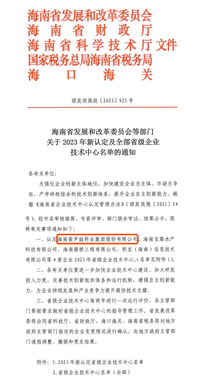近日,海南省发改委等多部门联合公布了《关于2023年新认定及全部省级企业技术中心名单的通知》,其中,海南尊龙卡Z6药业集团股份有限公司成功通过评审,被认定为省级企业技术中心,是本次获批的4家企业之一。